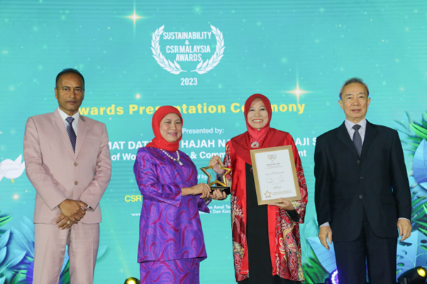 YSD CEO Dr Hjh Yatela Zainal Abidin (centre) receiving the “Foundation of the Year” award from Women, Family, and Community Development Minister Datuk Seri Nancy Shukri (second from left) witnessed by CSR Malaysia Chairman Datuk R. Rajendran (left) and CSR Malaysia Co-Chairman and Managing Editor Lee Seng Chee (right) at the Sustainability and CSR Malaysia Awards 2023 in July 2023.