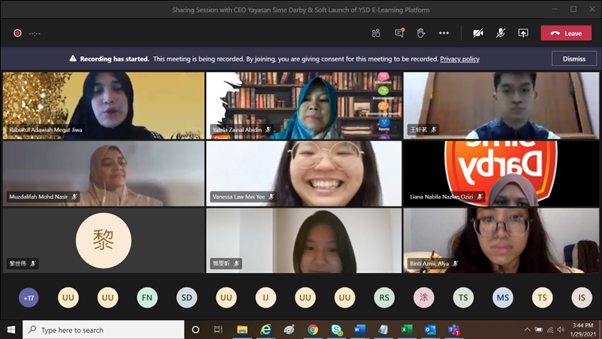 In August 2020, the foundation launched YSD THRIVE, a development programme for YSD Excellence scholars which offers tailored soft skills training (T), high-potential mentorship (H), resilient leadership through sharing sessions (R), industrial internships at Sime Darby companies (I) and volunteering opportunities (V). To fulfil the ‘E’ element in the programme, the foundation introduced the YSD e-Learning Platform which provides scholars with course information, lecture notes and other comprehensive learning activities which are all accessible online.